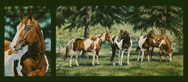 Subject: Head portrait of Paint stallion and pasture scene of paint broodmares and young stock.